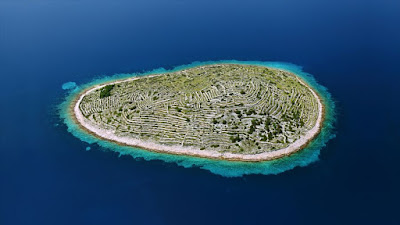 Zaintrygowała mnie ta niewielka i niezamieszkana wysepka archipelagu szybienickiego znajdująca się 1 km na północny wschód od zamieszkanej przez społeczność rolniczą wyspy Kaprije. Pokryta jest imponującym labiryntem kamiennym przypominającym linie papilarne odcisku palca. Geometryczna siatka kamiennego labiryntu rozciąga się na długość 23 km. To iście surrealistyczny kamienny krajobraz,wspaniały wytwór rolniczej cywilizacji. Kamienne murki, struktury, winnice, zapomniana architektura bez zaprawy murarskiej. Chciałbym się zagubić w takim wieczystym labiryncie czasu i przestrzeni.